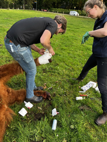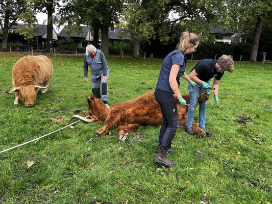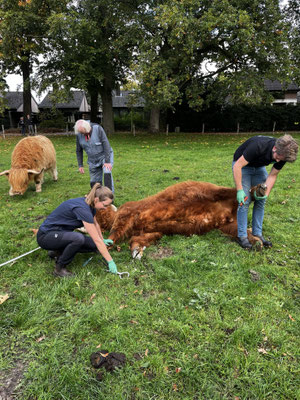 Onder toeziend oog van Mario en 'de meisjes' moesten in totaal vier mensen er aan te pas komen om hem te vangen en in een goede positie te houden. Onder narcose kon vervolgens de infectiehaard worden schoongemaakt en verbonden. Alle hoeven zijn gelijk gekapt. Dus zie je een Hooglander lopen met een verband aan zijn poot, dan is dit de reden.
