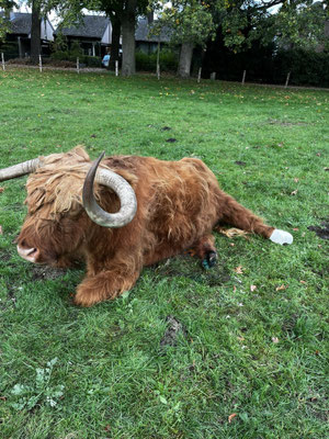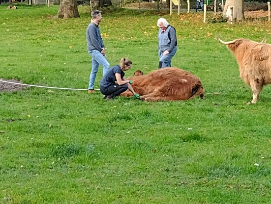 Mario belde zaterdag 11 oktober om zijn zorg uit te spreken over het lopen en staan van de oude os. Hij had zichtbaar last van een poot linksachter. Gelukkig konden we dezelfde dag een afspraak maken met de dierenarts, die een ontsteking aan zijn hoef constateerde. Met een ontstekingsremmer en pijnstiller voor het weekend werd direct op maandag het dier verdoofd en op locatie behandeld.